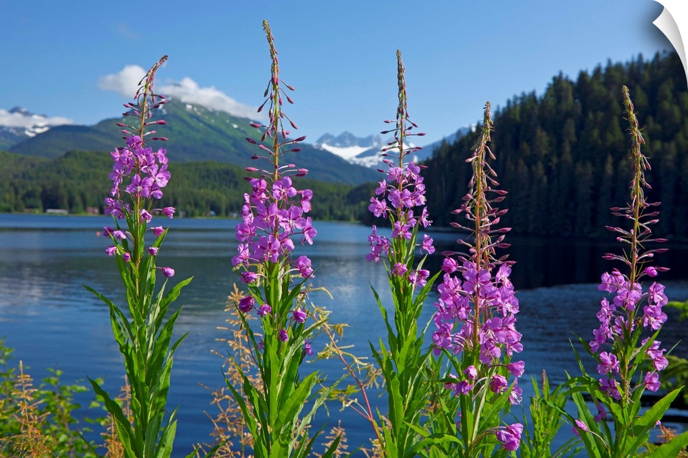 <p>Fireweed blooms along the shoreline of Auke Lake on a summer day, Auke Lake, Juneau, Alaska, Mendenhall Towers in the distance, Coast Range Mountains.</p>