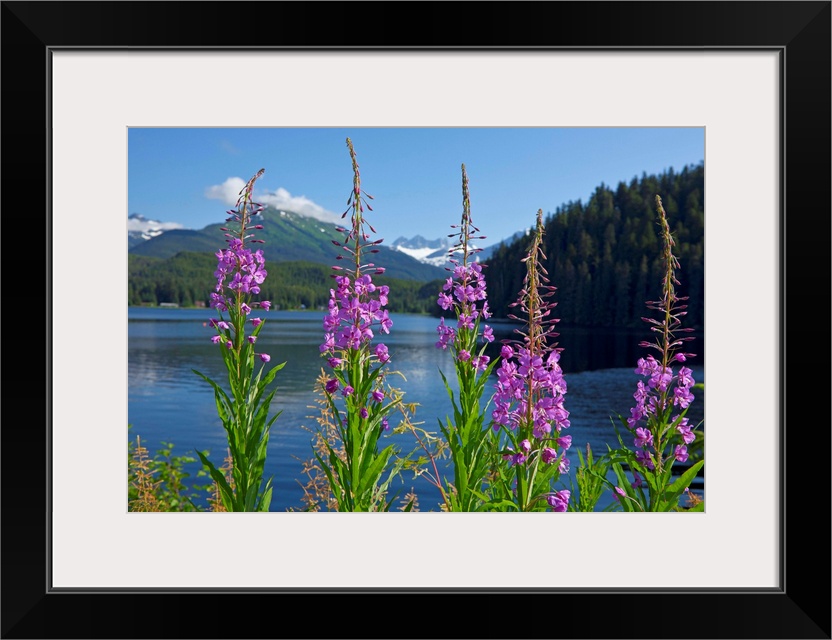 <p>Fireweed blooms along the shoreline of Auke Lake on a summer day, Auke Lake, Juneau, Alaska, Mendenhall Towers in the distance, Coast Range Mountains.</p>