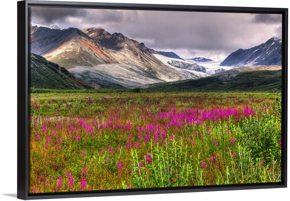 <p>View of the Gulkana Glacier from the Richardson Highway with fireweed in the foreground and the Alaska Range in the background.</p>