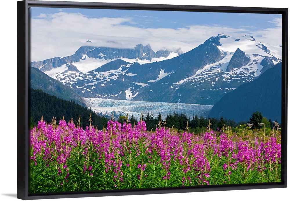 <p>Landscape, large photograph of Fireweed in the foreground, snow covered Mendenhall Glacier in the background, in Tongass National Park, in Juneau, Alaska.</p>