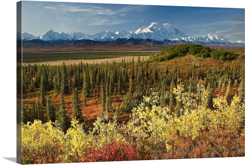 <p>A scenic photograph with taiga and fall colors in the foreground and a view of the Alaska Range, Denali, McKinley River in the background in the Wonder Lake area of Denali National Park, Alaska.</p>