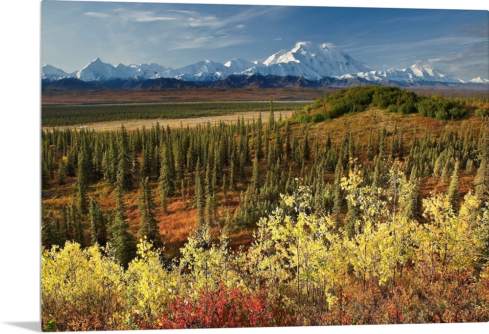 <p>A scenic photograph with taiga and fall colors in the foreground and a view of the Alaska Range, Denali, McKinley River in the background in the Wonder Lake area of Denali National Park, Alaska.</p>