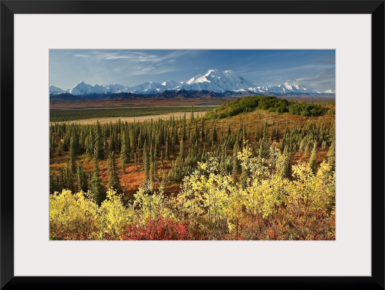 <p>A scenic photograph with taiga and fall colors in the foreground and a view of the Alaska Range, Denali, McKinley River in the background in the Wonder Lake area of Denali National Park, Alaska.</p>