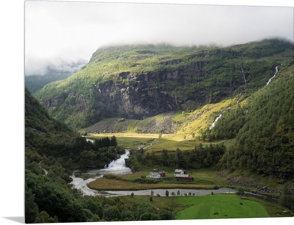 <p>Scenic view of river flowing through valley, Flam, Sogn og Fjordane County, Norway</p>