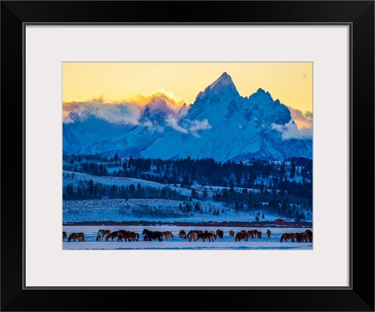<p>Herd of horses in the winter near the Grand Teton Mountains in Wyoming in the morning.</p>