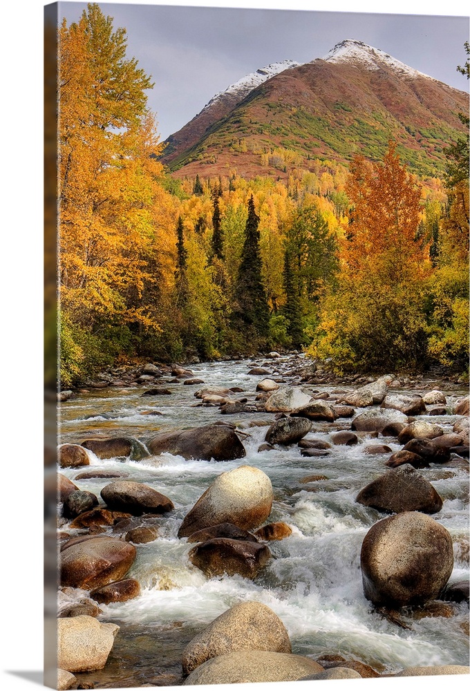<p>Vertical photograph on a large wall hanging of the rocky Little Susitna River leading toward a large mountain in the background, surrounded by a forest of fall foliage.</p>
