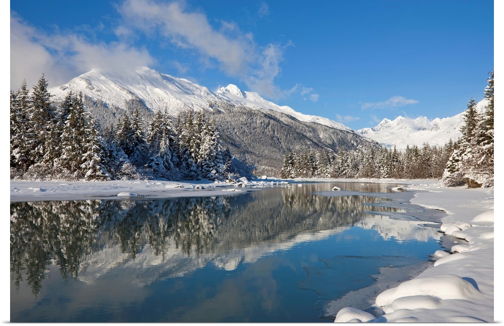 <p>A snowy winter wonderland awaits along the Mendenhall River, Mendenhall Glacier and Towers in the distance, Tongass Forest, Juneau, Alaska</p>