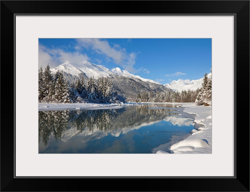 <p>A snowy winter wonderland awaits along the Mendenhall River, Mendenhall Glacier and Towers in the distance, Tongass Forest, Juneau, Alaska</p>