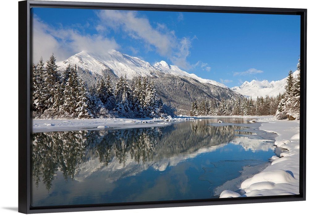 <p>A snowy winter wonderland awaits along the Mendenhall River, Mendenhall Glacier and Towers in the distance, Tongass Forest, Juneau, Alaska</p>