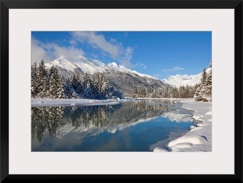 <p>A snowy winter wonderland awaits along the Mendenhall River, Mendenhall Glacier and Towers in the distance, Tongass Forest, Juneau, Alaska</p>