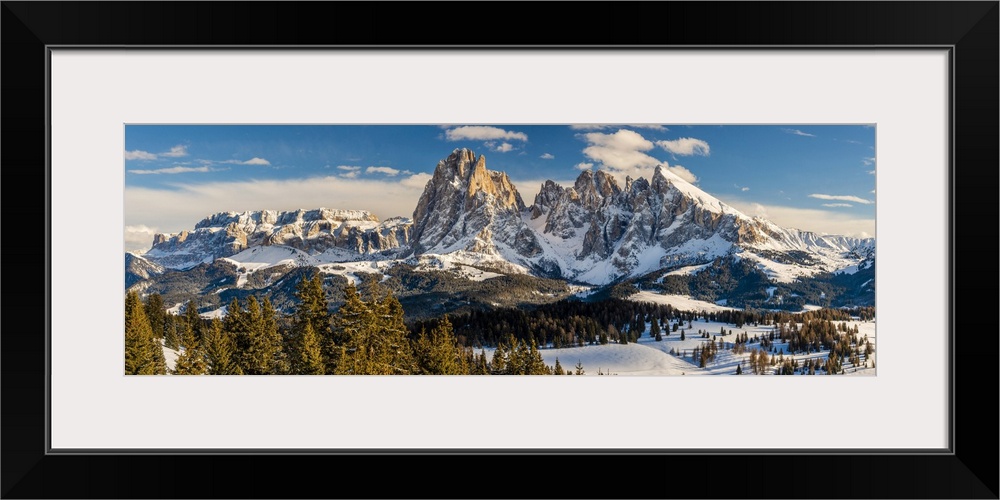 <p>Scenic winter view over Seiser Alm, Alpe di Siusi dominated by Sella group on the left and Sassolungo, Langkofel massif on the right, Dolomites, Alto Adige, South Tyrol, Italy. Alto Adige - South Tyrol, Seiser Alm - Alpe di Siusi, Italy.</p>