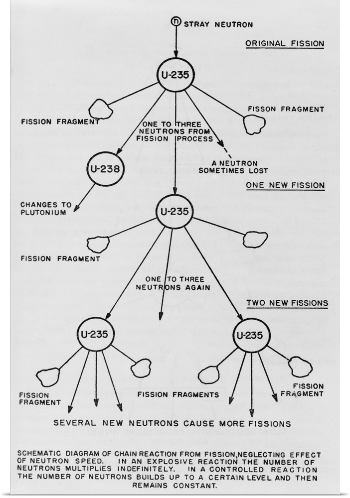 <p>Schematic diagram of chain reaction from fission of uranium 235. From a U.S. government publication by Henry DeWolf Smyth, c. 1940-45.</p>