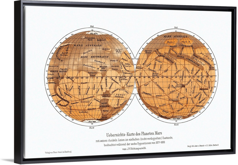 <p>Schiaparelli's map of Mars. This drawing of the two hemispheres of Mars was made by the Italian astronomer Giovanni Schiaparelli (1835-1910) between the years 1877 and 1888. He named the 'seas' and 'continents' of Mars, and called the straight surface features channels (mistranslated as canals). He also noticed that the patterns on the surface changed with the Martian seasons. He wrongly assumed this to be due to seasonal changes in vegetation. It is now known that Mars is swept by powerful dust storms which alter the surface features. The accompanying text is in German.</p>