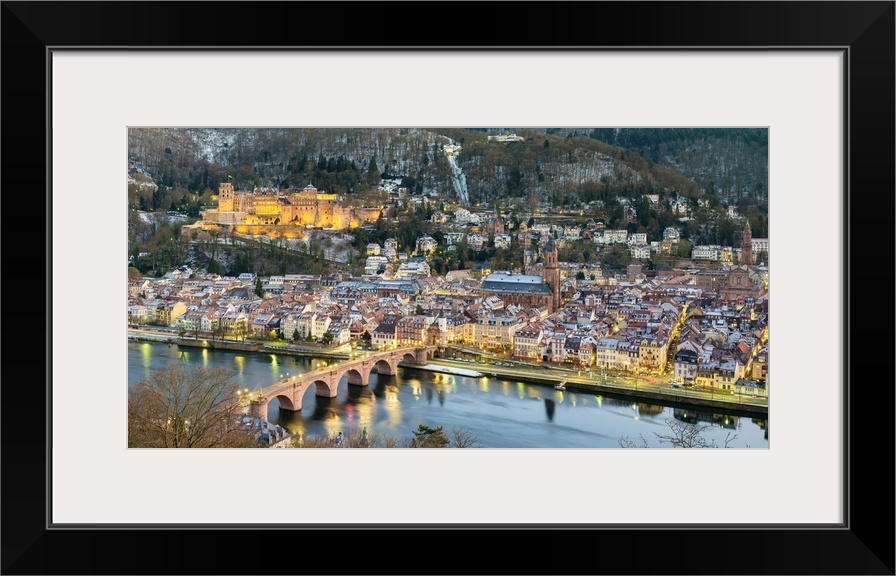 <p>Germany, Baden-Wurttemberg, Heidelberg. Schloss Heidelberg castle, Alte Brucke (old bridge), and buildings in the Altstadt (old town) on the Neckar River at dusk.</p>
