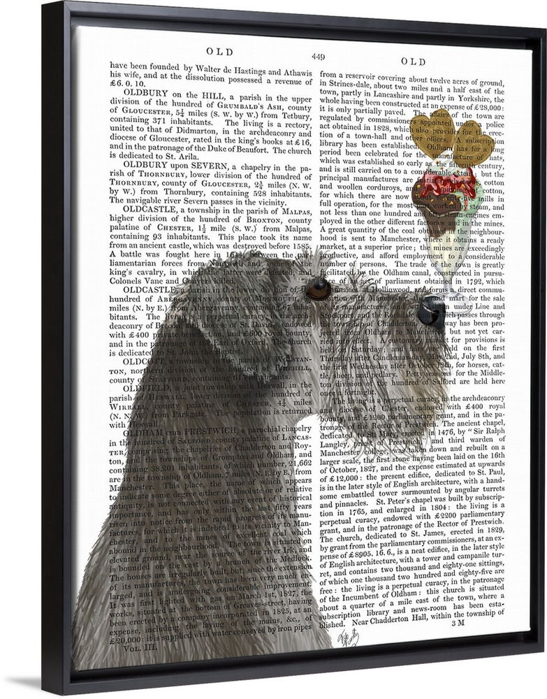 <p>Decorative artwork of a Schnauzer balancing an ice cream sundae on its nose, painted on the page of a book.</p>