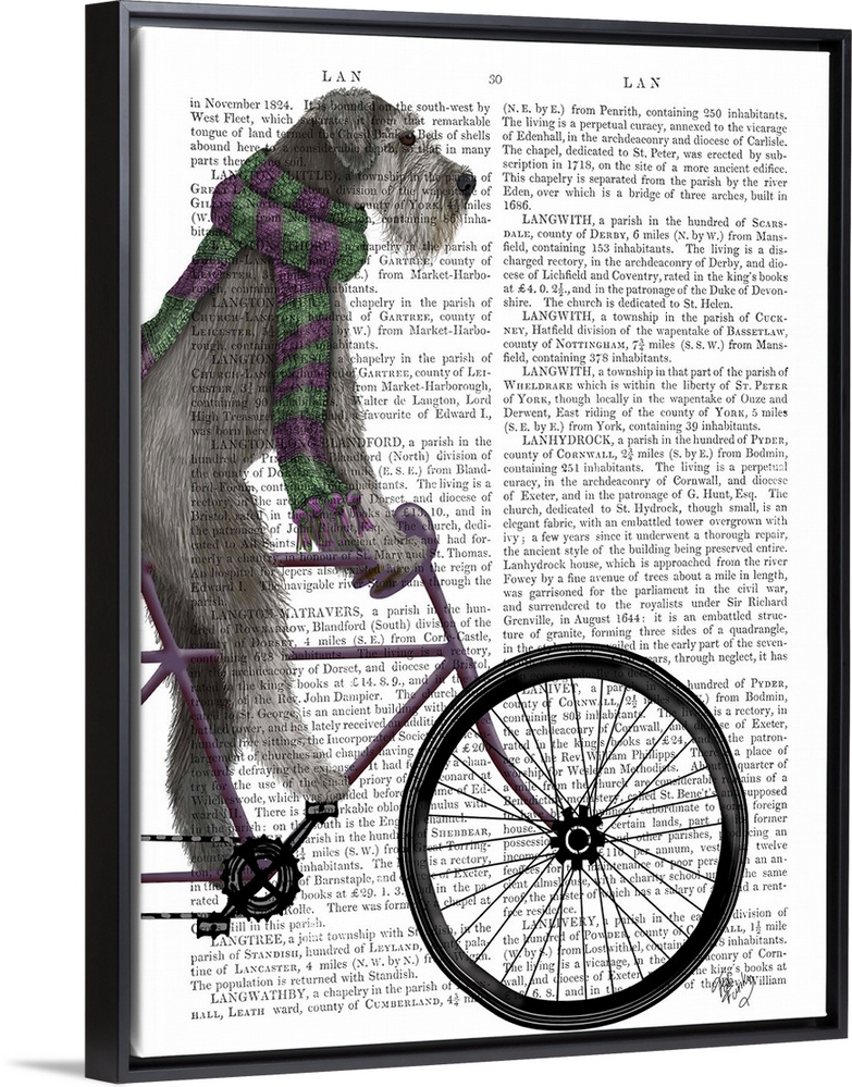 <p>Decorative artwork with a Schnauzer wearing a scarf and riding on a bicycle, painted on the page of a book.</p>