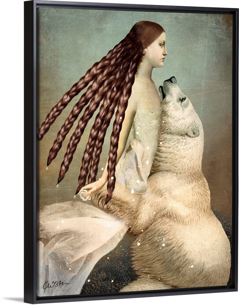 <p>A digital composite of a polar bear embracing a female with long hair.</p>