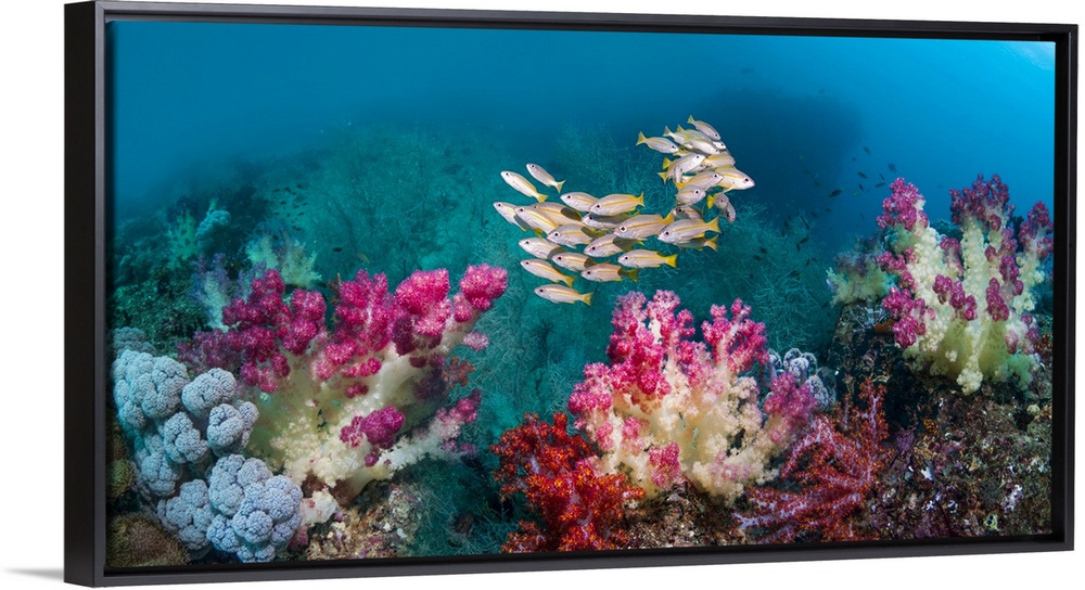 <p>Composite image of a small school of bigeye snappers (Lutjanus lutjanus) swimming over coral reef scenery with soft corals (Dendronephthya sp.). Photographed in Triton Bay, Kaimana Regency, West Papua, Indonesia.</p>