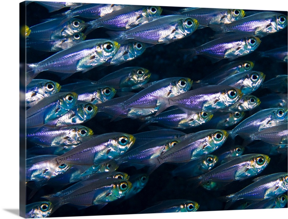 <p>Glass school of fish, swim in compact groups to protect themselves from predators.</p>