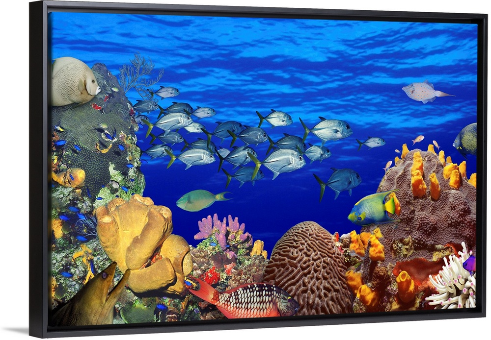 <p>A digital composite of fish swimming in a coral reef to create an underwater seascape on this horizontal wall art.</p>