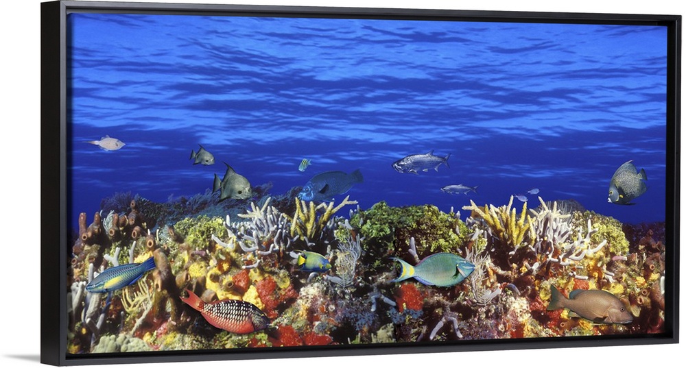 <p>Horizontal photograph on a large canvas of numerous types of tropical fish swimming around a colorful coral reef in deep blue waters.</p>