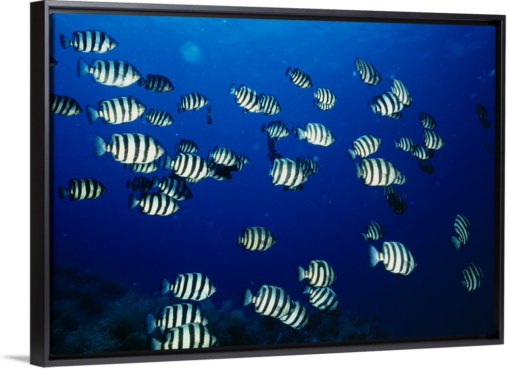 <p>Photograph taken of a large school of black and white fish swimming deep down near coral.</p>