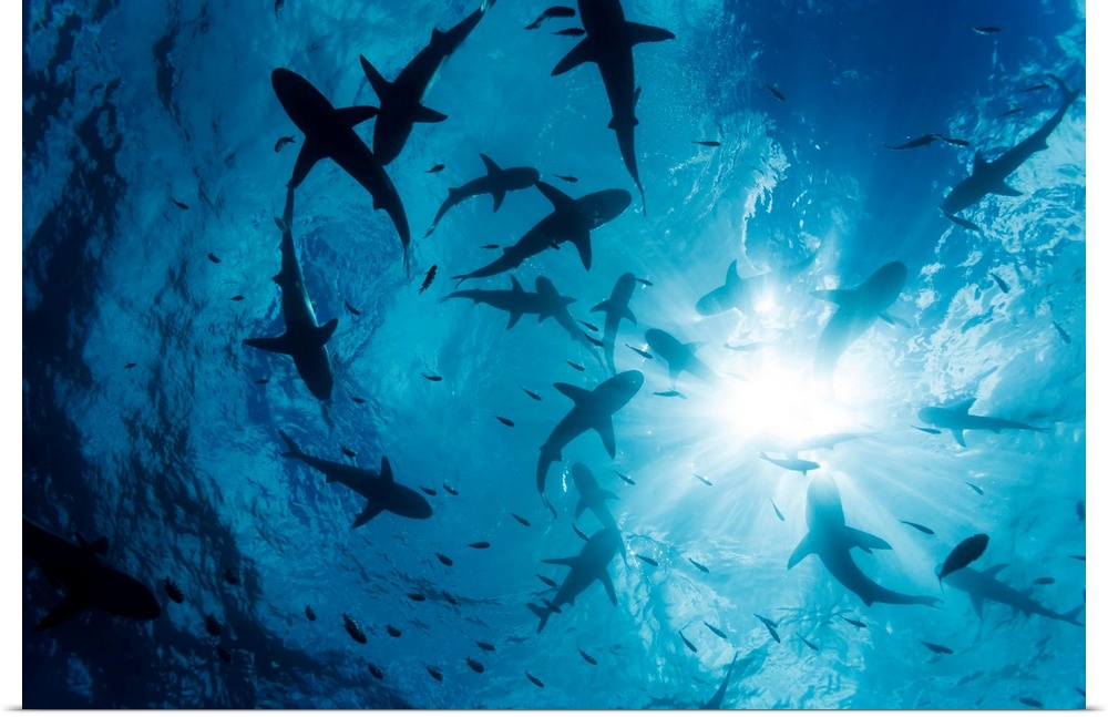 <p>School of Grey reef sharks (Carcharhinus amblyrhynchos) at the surface of the water off the island of Yap, Yap, Micronesia.</p>