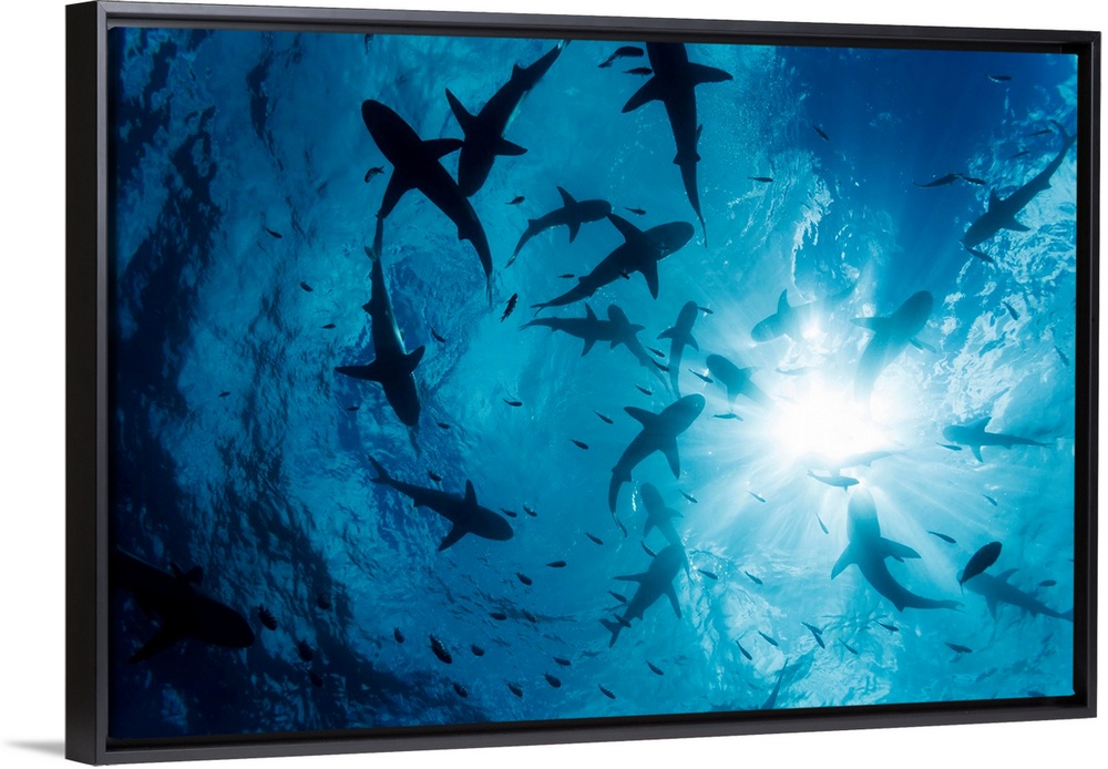 <p>School of Grey reef sharks (Carcharhinus amblyrhynchos) at the surface of the water off the island of Yap, Yap, Micronesia.</p>