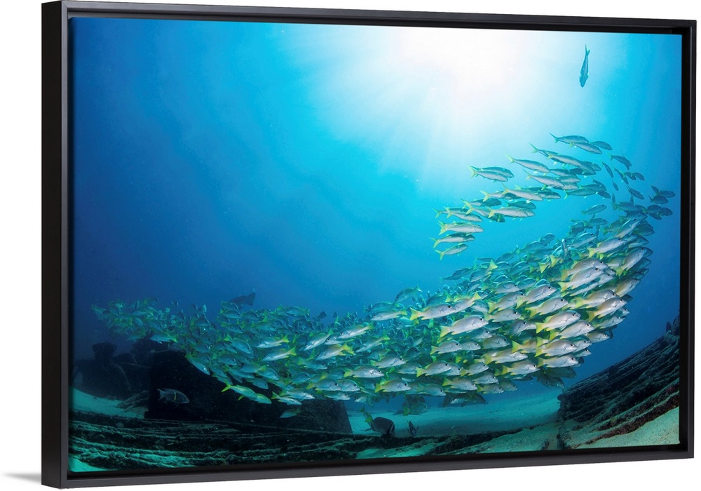<p>School of yellow snapper swimming over the wreck of El Vencedor in the Sea of Cortez.</p>