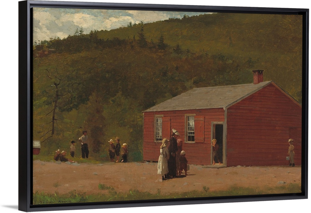 <p>School Time, by Winslow Homer, 1874, American painting, originally oil on canvas. Twelve children and their female school teacher near a small red school house. A forested hill is the backdrop for the rural scene.</p>