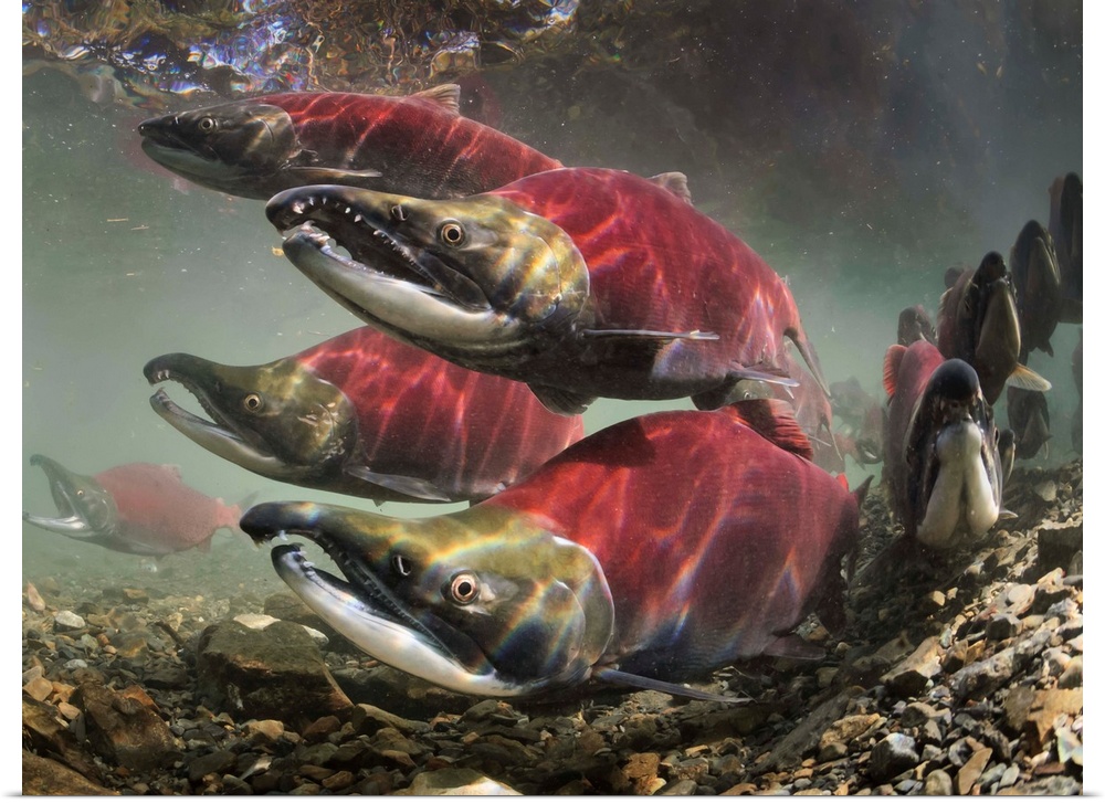 <p>Schooled mature sockeye/red salmon (Oncorhynchus nerka; Salmonidae) arriving on spawning grounds. In background, male threat display by gaping. Taken under water in Power Creek, a tributary of Eyak Lake and the Copper River Delta near Cordova and Prince William Sound, summer, South Central, Alaska.</p>