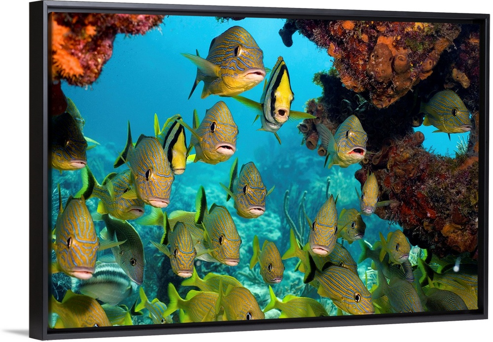 <p>To ward off larger predators, a variety of fish school together including French grunt (Haemulon flavolineatum), Bluestriped grunt (Haemulon sciurus), and Porkfish (Anisotremus virginicus)</p>