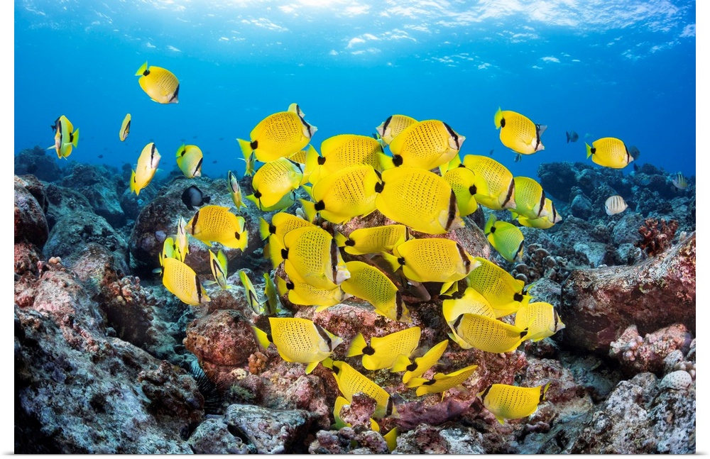 <p>Schooling Milletseed butterflyfish (Chaetodon miliaris), endemic to Hawaii; Hawaii, United States of America.</p>