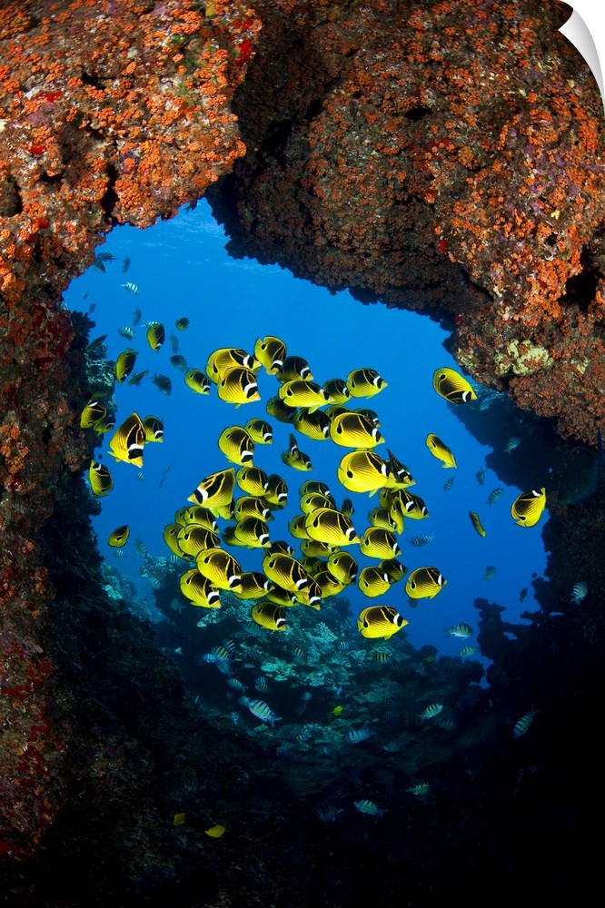 <p>Schooling raccoon butterflyfish (Chaetodon lunula) framed in a lava formation off the island of Lanai, Hawaii.</p>