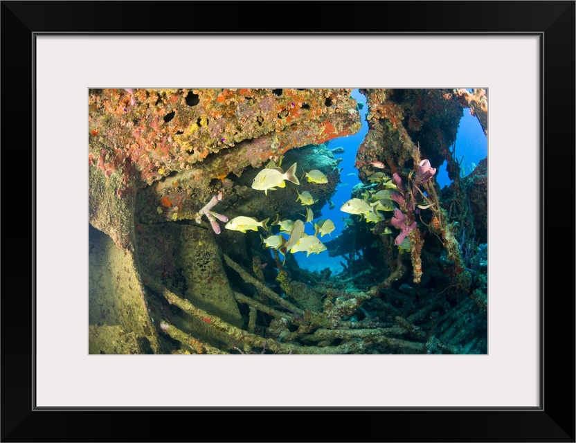 <p>schooling snappers, Wreck of the RMS Rhone, iron-hulled steam sailing vessel, sank after the Great Hurricane of 1867 off the coast of Salt Island, near Tortola, British Virgin Islands, Caribbean</p>