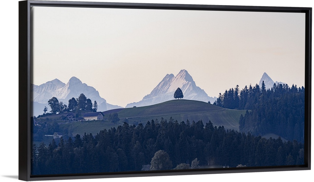 <p>Schreckhorn, Wetterhorn, Finsteraarhorn and Eiger mountains view from green rolling hills, Sumiswald, Emmental, Bern, Switzerland, Europe</p>