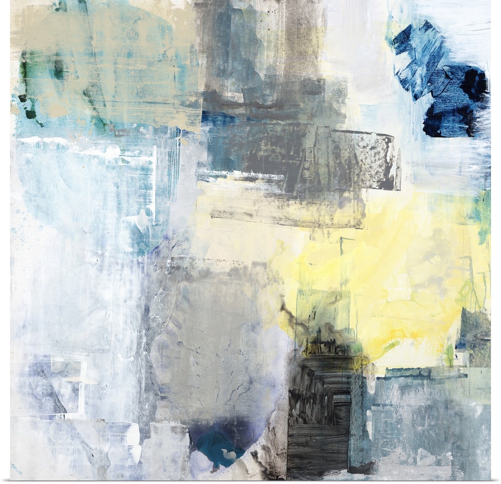 <p>Contemporary abstract painting with pale paint textures layered next to and on top of each other with pops of blue.</p>