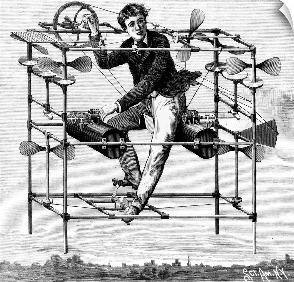 <p>Scientific American illustration of the Flying Bedstead (W Ayers flying machine), which was pedal assisted. 1885.</p>