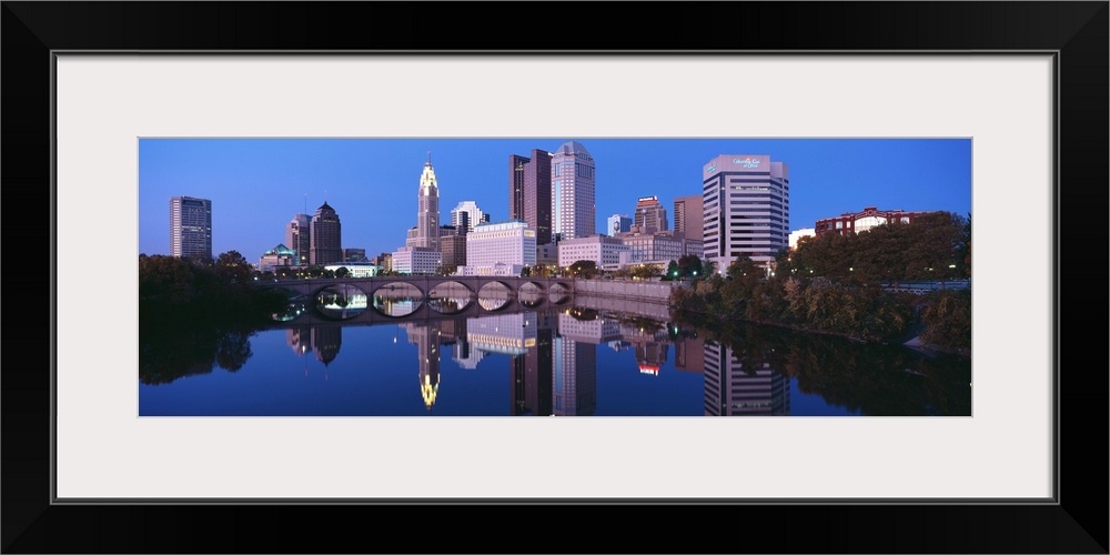 <p>Scioto River and Columbus Ohio skyline, the capital city, at dusk with lights on</p>