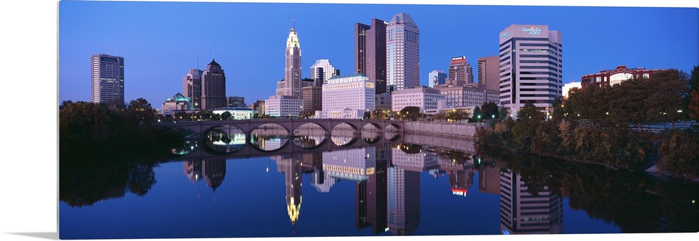 <p>Scioto River and Columbus Ohio skyline, the capital city, at dusk with lights on</p>