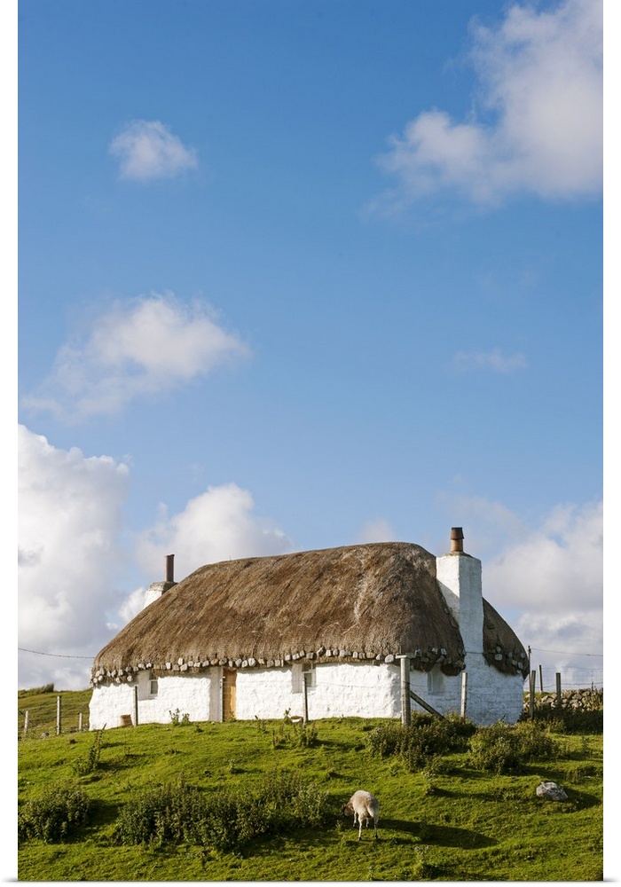 <p>UK, Scotland, Outer Hebrides, North Uist. A traditional thatched whitehouse on the south east coast of North Uist.</p>