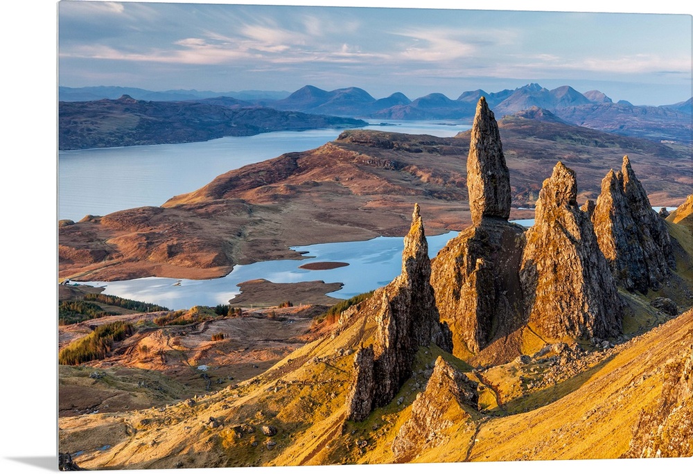 <p>UK, Scotland, Great Britain, Highlands, Inner Hebrides, Isle of Skye, The Old Man of Storr, overlooking Loch Leathan and Sound of Raasay, Borve.</p>