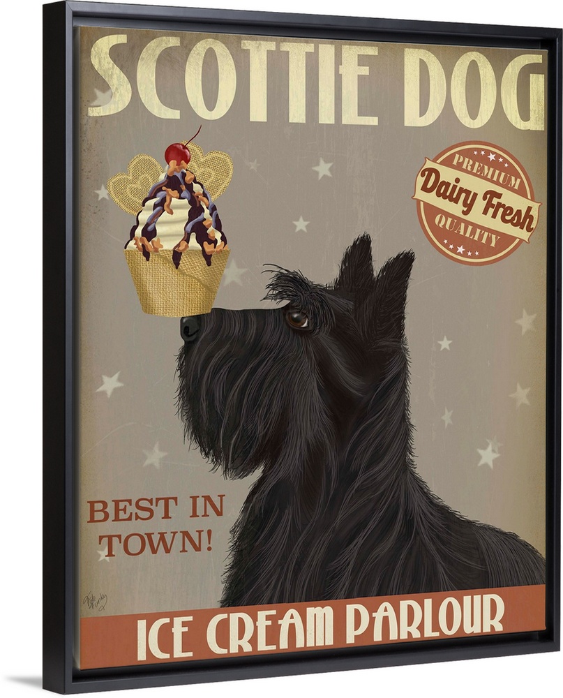 <p>Decorative artwork of a Scottish Terrier balancing an ice cream sundae on its nose in an advertisement for an ice cream parlour.</p>
