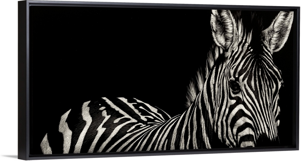 <p>Contemporary scratchboard artwork of a zebra, emphasizing its stripes.</p>