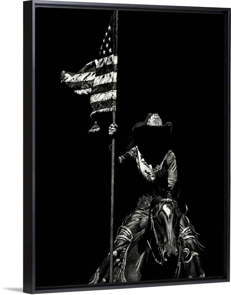<p>Black and white lifelike illustration of a cowboy holding an American flag while sitting on the back of a horse.</p>
