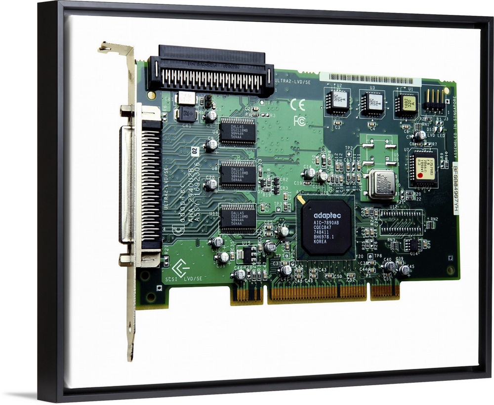 <p>SCSI card. This is a small computer system interface (SCSI) card. It is used to connect several peripheral devices to a single peripheral component interconnector (PCI) slot.</p>