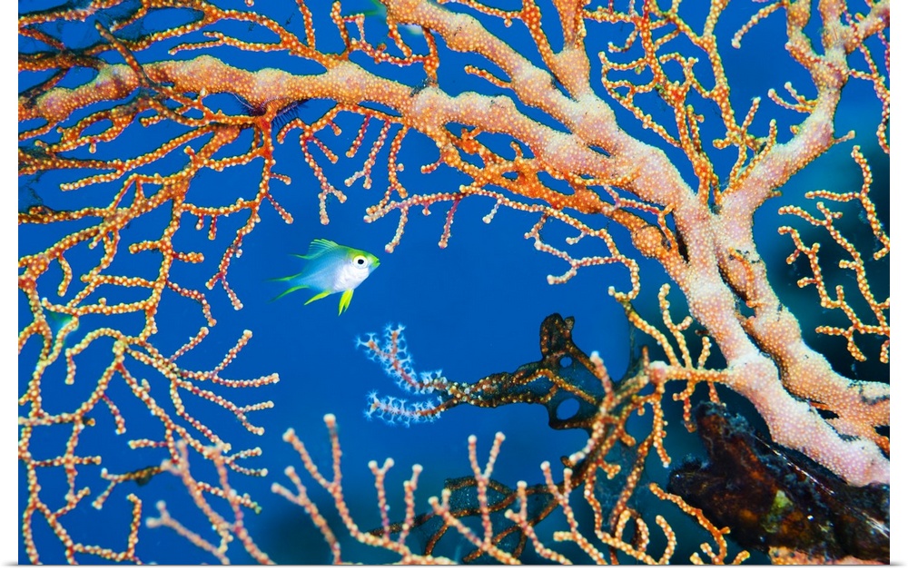 <p>A damselfish swims behind an orange seafan. Photo taken in Bali, Indonesia</p>
