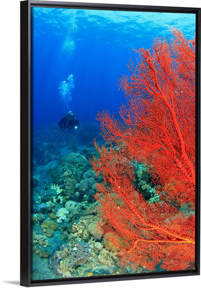 <p>Scuba diver, brilliant red sea fans (Melithaea sp,), Komba Island, Flores Sea, Indonesia</p>