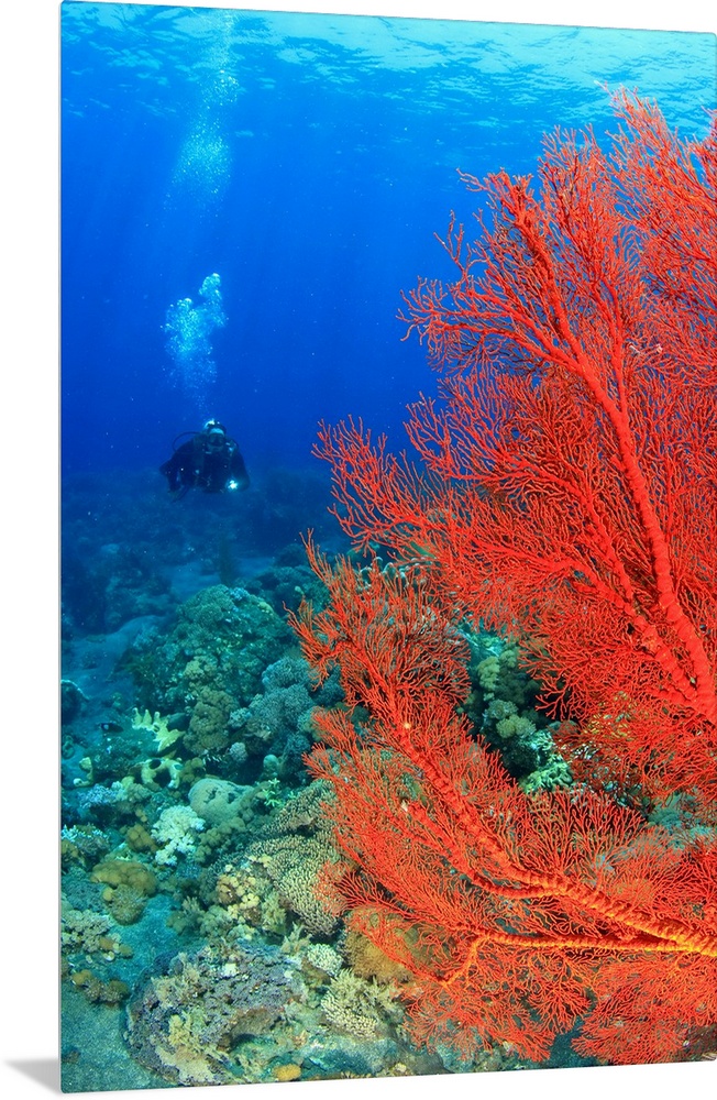 <p>Scuba diver, brilliant red sea fans (Melithaea sp,), Komba Island, Flores Sea, Indonesia</p>