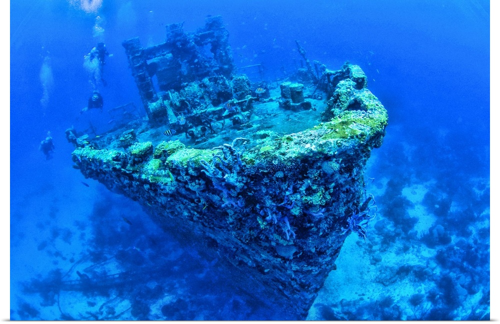 <p>Scuba divers swimming near Jane C Shipwreck in sea, Aruba, Caribbean</p>